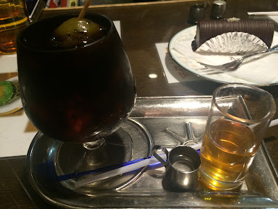當日東京氣溫約5度左右,室外寒風刺骨,許多客人都是上了年紀的老翁老婦,大都點選這款裝滿冰塊的冰咖啡。梅ダッチコーヒー 盛裝小盤當中,服務員端上後會直接將冰滴咖啡迅速倒入冰塊擱著梅子串的空杯裡,梅酒和糖水依個人口味隨意,從合羽橋道具街一路走來幾乎涷僵頻頻哈氣搓手,碰上酒精性飲料,自然是豪氣全數加入。